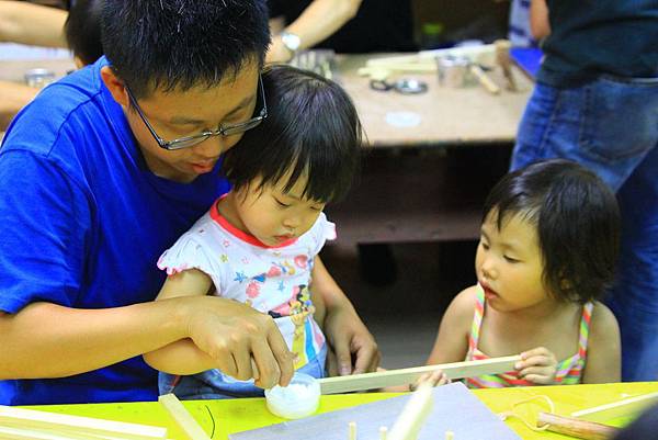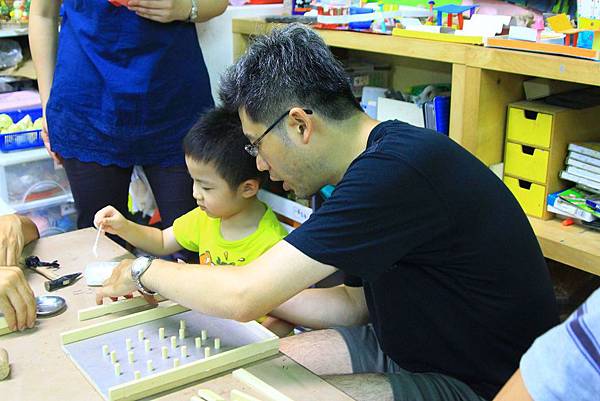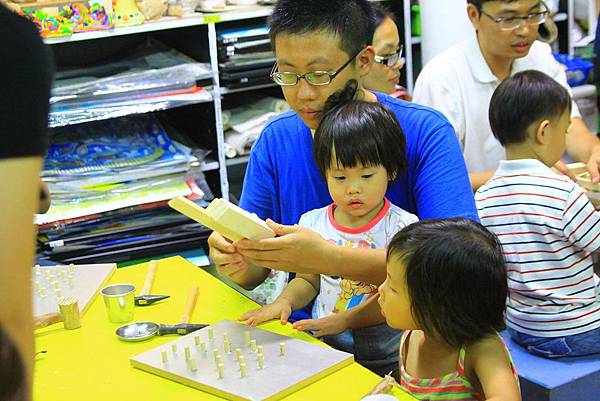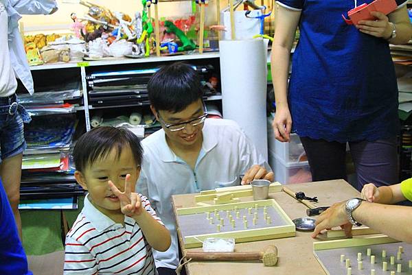 老師首先拿一塊木板,木槌,木釘,示範給大家看